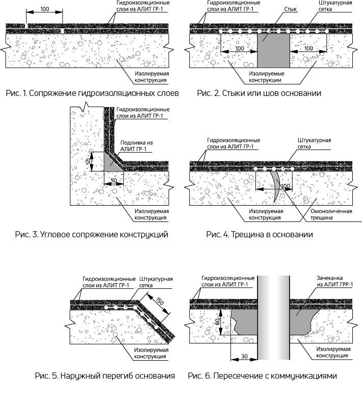 Способ укладки: Рабочие стыки в слое гидроизоляции должны перекрываться вышележащим слоем с нахлестом не менее 100 мм (рис. 1). В угловых стыках конструкций перед нанесением гидроизоляции необходимо устройство подливки из раствора на основе АЛИТ ГР-1 (рис. 3) для обеспечения более качественной укладки гидроизоляционных слоев. В местах пересечения гидроизоляционного слоя со швами между изолируемыми конструкциями наносится дополнительный слой гидроизоляции, который необходимо армировать штукатурной полимерной или стекловолокнистой сеткой с шагом нитей 5 × 5 или 7 × 7 мм (рис. 2). В местах установки водосливов, прохождения коммуникаций и т. п. производится расшивка бетона (кирпичной кладки) вокруг этих деталей с последующей зачеканкой их гидроизоляционной расширяющейся растворной смесью на основе АЛИТ ГРР-1 в два слоя (рис. 6). При наличии в изолируемой поверхности трещин с раскрытием более 0,3 мм их необходимо инъектировать составами на основе сухой смеси АЛИТ ИР-1. Прираскрытии трещин менее 0,3 мм на поверхность наносится перекрывающий слой на основе сухой смеси ремонтной тонкодисперсной цементной для перекрытия трещин АЛИТ СРТ-1 (см. раздел «Ремонтные материалы»). В местах пересечения гидроизоляционного слоя с трещиной первый слой изоляции необходимо армировать штукатурной полимерной или стекловолокнистой сеткой шириной 100 мм (рис. 4). В местах перегиба изолируемой поверхности первый гидроизоляционный слой армируется полимерной штукатурной сеткой с шагом нитей 5 × 5 или 7 × 7 мм (рис. 5).