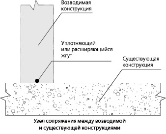 Подготовка основания: Поверхность прилегающих конструкций должна быть крепкой и ровной, очищенной от пыли, грязи, извести, масел, жиров, остатков масляной и эмульсионной красок. На поверхности не должно быть капельной влаги. Для обеспечения герметичности холодные швы и швы с прилегающими конструкциями должны быть уплотнены уплотняющими или расширяющимися жгутами (рис).