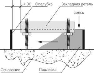 устанавливают опалубку вокруг закладной части с зазором более 30 мм (рис. 1);