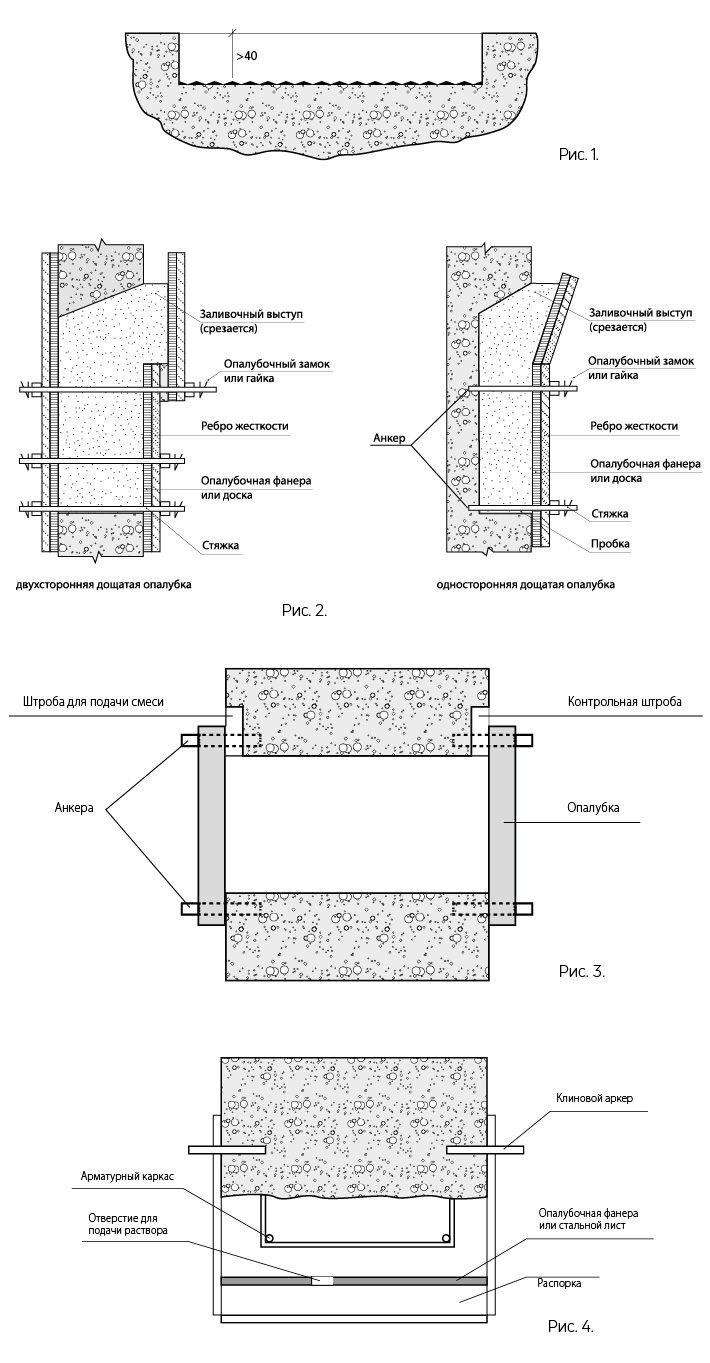 Подача смеси осуществляется через заливочное устройство в опалубке (рис. 2) или через предварительно вырезанные в бетоне штробы (рис. 3). При нагнетании растворной смеси под давлением ее подача осуществляется через нижний штуцер опалубки (рис. 4).