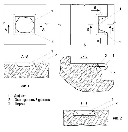 Кромки дефектных участков следует оконтурить алмазным инструментом под углом к поверхности. Рис. 1,2.